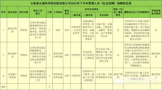 昆明信息港訊 實(shí)習(xí)記者姚仲恒 近期,云南省交通科學(xué)研究院有限公司發(fā)布招聘公告,面向社會(huì)招聘和校園招聘管理人員共計(jì)9人,其中社會(huì)招聘3人,校園招聘6人。