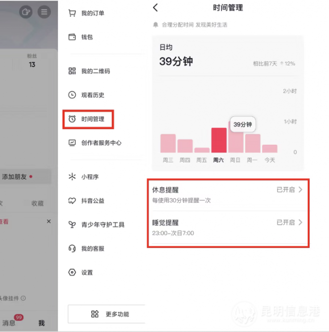 近期,抖音還推出了時間管理工具,用戶在“我—側(cè)邊欄—時間管理”中可自主設(shè)置休息提醒和睡眠提醒,達到約定的使用時長后,系統(tǒng)會提醒用戶及時休息。同時,系統(tǒng)會顯示用戶每日使用時長及變化趨勢。