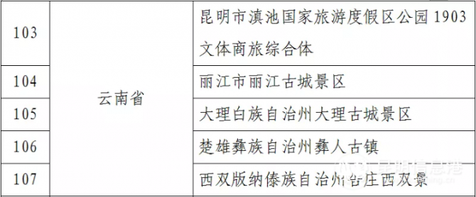 其中,云南省昆明市滇池國家旅游度假區(qū)公園1903文體商旅綜合體、麗江市麗江古城景區(qū)、大理白族自治州大理古城景區(qū)、楚雄彝族自治州彝人古鎮(zhèn)、西雙版納傣族自治州告莊西雙景共計5家單位擬入選。