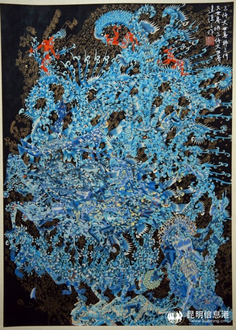 徐建德的線描畫及重彩畫均有強(qiáng)烈的視角沖擊力,獨(dú)樹一幟,而其最具代表性的意念重彩畫,就發(fā)端于他的意念線描作品。在淺土黃色的畫紙上,非凡的線條,組成了無數(shù)的圖形,兩位白色的美麗女性依偎在一起,似乎正說著悄悄話,在她們周圍,是同樣由線條構(gòu)成的叫不出名字的鳥兒,這些由線條構(gòu)成的圖形看似毫無規(guī)律地延伸著、舒緩著,好像要刺破天空,又好像是伸向遠(yuǎn)方,在紅、白、黑、綠、黃、藍(lán)、橙、褐等色彩的渲染下,安詳和諧地組合在一起,充滿了瑰麗而神秘的氣息。徐建德給這幅畫取名《還原心圖》。在香港工作的四川美院的老同學(xué)被震撼了,這種突破了傳統(tǒng)畫派束縛的畫法,超乎了具象與抽象的藝術(shù)表現(xiàn),是他以前從未見過的。他問徐建德這是什么畫,徐建德說不知道,畫的是自己的冥想,是夢(mèng)里的人生和意念,那就叫意念畫吧。