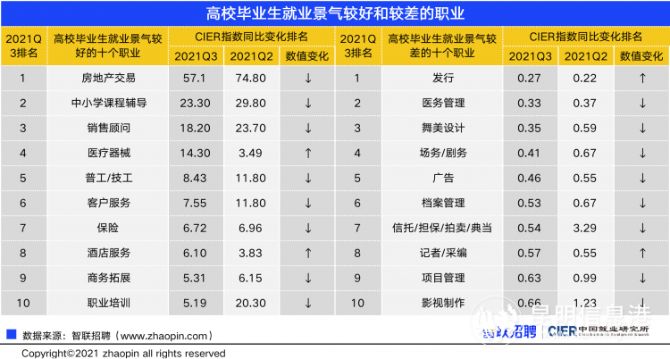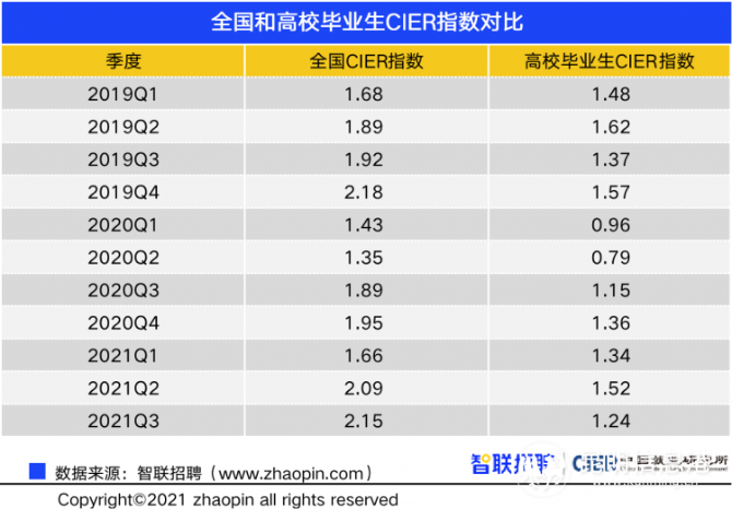 中國人民大學中國就業(yè)研究所和智聯(lián)招聘近日聯(lián)合發(fā)布《2021年三季度高校畢業(yè)生就業(yè)市場景氣報告》,其中指出,本季度高校畢業(yè)生就業(yè)市場景氣指數(shù)(CIER)為1.24,相比上個季度下降,相比去年同期上升,總體上還是低于全國水平。