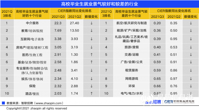 本季度高校畢業(yè)生就業(yè)市場景氣指數(shù)最好的行業(yè)為中介服務業(yè),為22.3。此外,教育/培訓/院校、互聯(lián)網(wǎng)/電子商務、房地產(chǎn)/建筑/建材/工程、醫(yī)藥/生物工程等行業(yè)也相對容易就業(yè)。