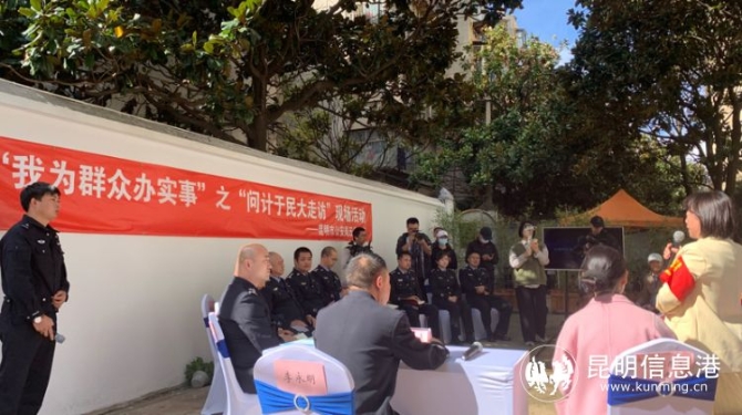 昆明信息港訊 記者合宇聰 10月4日下午,昆明市公安局五華分局在蓮華派出所梧桐警務室開展“我為群眾辦實事”之“問計于民大走訪”活動?;顒又?,市民代表就飼養(yǎng)烈性犬、酒吧噪音擾民、商家糾紛等線索向警方反映,分局相關(guān)警種民警現(xiàn)場聽取、現(xiàn)場辦理、現(xiàn)場解答。