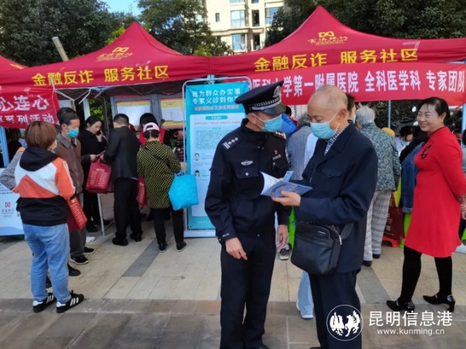 昆明信息港訊 記者合宇聰 11月4日,昆明市公安局西山分局聯(lián)合市公安局刑偵支隊、富滇銀行、滇醫(yī)通、醫(yī)大社區(qū)居委會等單位,在西山區(qū)醫(yī)大廣場小區(qū)共同舉辦“金融知識進萬家·爭當防騙好網(wǎng)民”反詐主題宣傳活動。