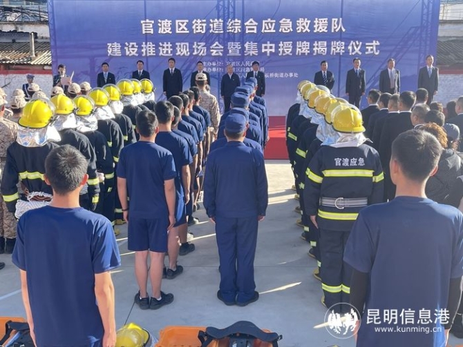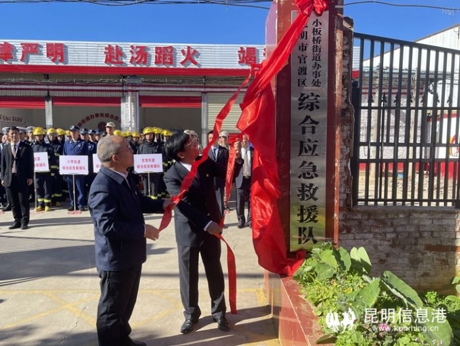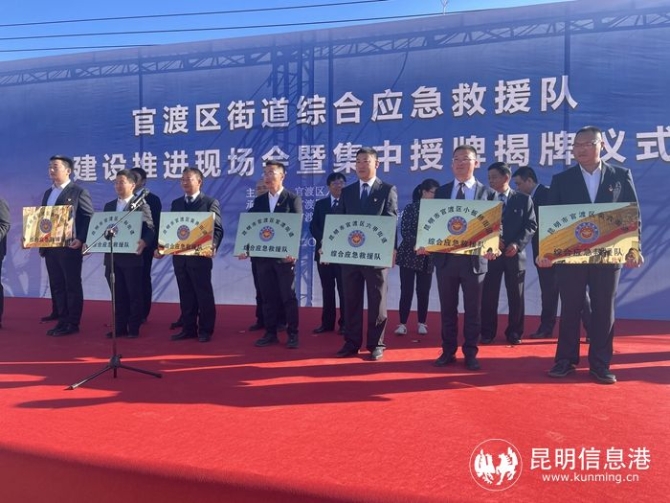 現(xiàn)場,與會(huì)領(lǐng)導(dǎo)為官渡區(qū)8個(gè)街道綜合應(yīng)急救援隊(duì)伍授牌并現(xiàn)場觀摩了小板橋街道綜合應(yīng)急救援隊(duì)進(jìn)行的應(yīng)急實(shí)戰(zhàn)演練,和麗川書記、昆明市應(yīng)急局黨委書記、局長李開德共同為小板橋街道綜合應(yīng)急救援隊(duì)揭牌。