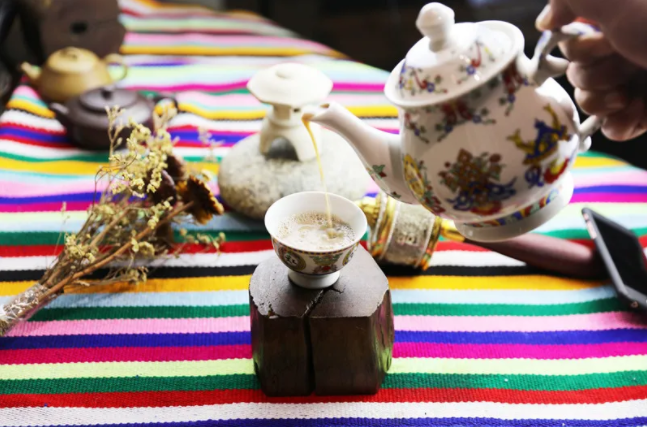 酥油茶是藏族人民日常生活不可缺少的必需品。制作時(shí)簡(jiǎn)單方便:先用土茶倒入茶筒,加入酥油、鹽和精制香料,用攪捧上下反復(fù)攪打成水乳交融狀,即可斟用。飲之,色香味美,回味無(wú)窮。