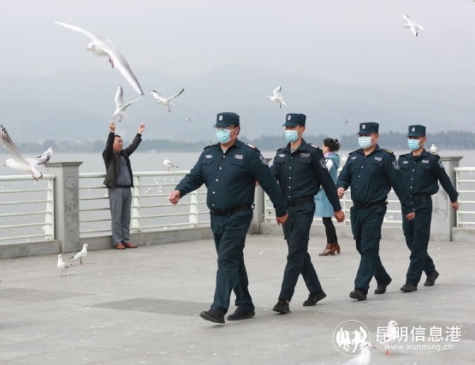 對(duì)于日常的工作,滇維安保公司“水陸空”全方位管理已經(jīng)成為常態(tài)。在空中,主要是防止孔明燈和風(fēng)箏的放飛;在陸地,主要維護(hù)草海大壩的市政設(shè)施、取締無證經(jīng)營攤販以及勸阻不文明行為;在水中,協(xié)助滇管局查處違法捕魚、釣魚的行為。除了這些工作外,滇維安保公司還會(huì)配合交警完成交通疏導(dǎo),配合公安部門完成治安巡邏。在海鷗飛臨大壩期間,此區(qū)域嚴(yán)禁一切飛行器,包括無人機(jī)航拍,以避免傷及紅嘴鷗。滇維安保公司已成為海埂名片的維護(hù)者和“云鳥精靈”的守護(hù)神。