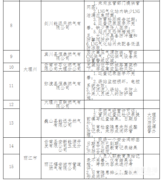 天然氣供應企業(yè)安全隱患屢禁不止。燃氣企業(yè)相關記錄填寫缺失、不規(guī)范;供氣場站安全隱患未全面消除,如安全間距不足、監(jiān)控損壞、電控系統(tǒng)失效等;部分燃氣企業(yè)經(jīng)營管理問題較大,手續(xù)不齊全、無經(jīng)營許可證。