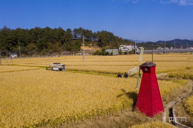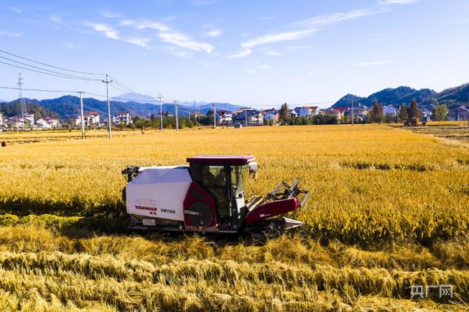眼下正是晚稻豐收時(shí)節(jié),杭州市臨安區(qū)於潛鎮(zhèn)光明農(nóng)場的700余畝稻田喜獲豐收,遍野金黃、沉甸甸的稻穗壓彎了稻稈,陣陣微風(fēng)卷起金色波浪。田間地頭機(jī)器轟鳴,收割機(jī)在稻田間來回穿梭作業(yè),一派繁忙豐收景象。