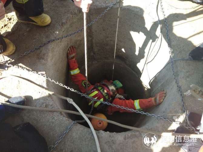 但由于井口狹小,只能供一名指戰(zhàn)員下井救援。時間就是生命!指揮員立即派出1名經(jīng)驗豐富的骨干佩戴好個人防護裝具,確保自身安全后攜帶救援吊帶和安全繩深入井下實施救援。警戒組負責(zé)疏散周圍圍觀群眾和觀察現(xiàn)場情況,確?,F(xiàn)場空氣流動和保證救援指戰(zhàn)員自身安全。