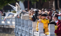 11月21日,游客在海埂大壩上投喂紅嘴鷗。
