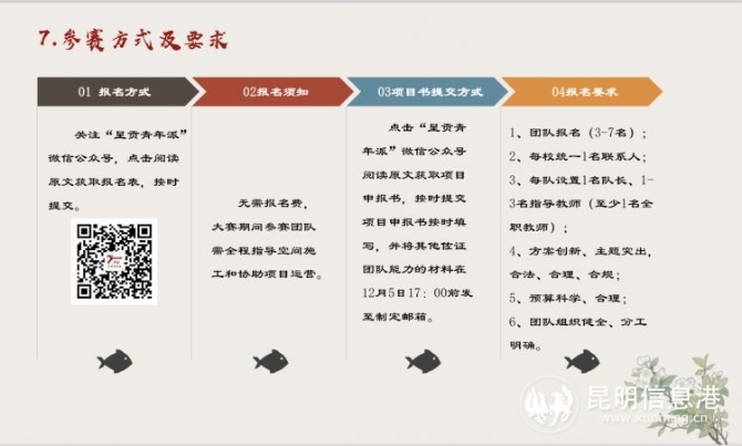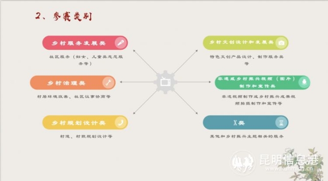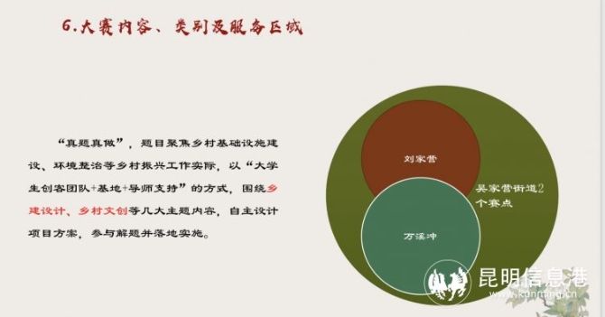 本屆比賽由呈貢區(qū)創(chuàng)文社會(huì)志愿服務(wù)指揮部、呈貢區(qū)委統(tǒng)戰(zhàn)部、共青團(tuán)呈貢區(qū)委聯(lián)合開展,分為大賽發(fā)布、賽前調(diào)研、項(xiàng)目征集、項(xiàng)目路演、簽訂合同、落地孵化、項(xiàng)目結(jié)項(xiàng)等流程,共設(shè)置了3個(gè)專項(xiàng)賽道,分別是“互聯(lián)網(wǎng)+”媒介賦能宣傳賽道、“劉家營(yíng)”非遺賦能空間賽道、“萬溪沖”鄉(xiāng)史賦能設(shè)計(jì)賽道。普通高校本專科學(xué)生及在讀研究生均可參賽,參賽團(tuán)隊(duì)需根據(jù)所提供的村莊概況、發(fā)展思路、業(yè)態(tài)類型及空間信息資料,選擇其中一個(gè)社區(qū)具體題目作為團(tuán)隊(duì)參賽項(xiàng)目。