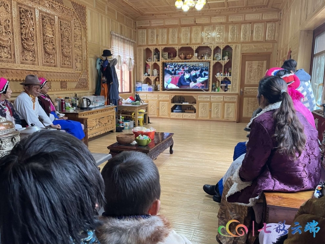 一大早,香格里拉市建塘鎮(zhèn)金龍社區(qū)朱合老人一家身著節(jié)日盛裝,圍坐在電視機前聚精會神地收看省第十一次黨代會開幕會。