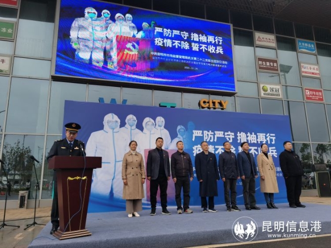 昆明信息港訊 記者俞逍 11月28日上午,昆明市市場(chǎng)監(jiān)管局空港分局進(jìn)口冷鏈疫情防控進(jìn)駐寶象萬(wàn)噸值守周年紀(jì)念暨主題黨日活動(dòng)在昆明寶象萬(wàn)噸展廳前舉行。