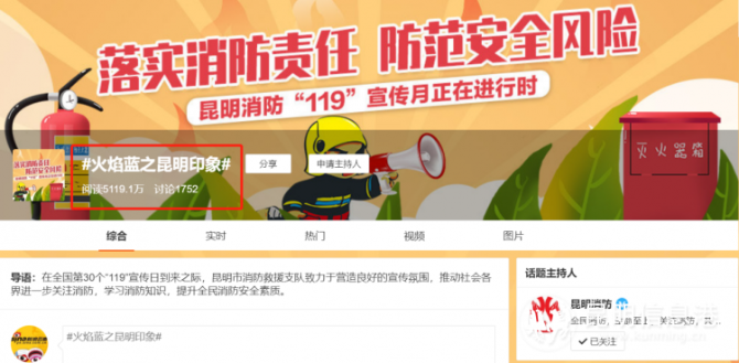 同時(shí),通過(guò)在全媒體平臺(tái)共同打造“119”消防宣傳日話題陣地,聯(lián)動(dòng)電視媒體、新聞媒體、網(wǎng)絡(luò)媒體、網(wǎng)絡(luò)大V,建立“119”全媒體宣傳矩陣。通過(guò)微博熱門(mén)話題、文字、圖片、創(chuàng)意海報(bào)、視頻、直播、volg等豐富形式產(chǎn)出優(yōu)質(zhì)宣傳內(nèi)容。11月9日至10日,#火焰藍(lán)之昆明印象#榮登微博全國(guó)熱搜第三。截止11月25日,微博話題總閱讀量已超5100萬(wàn)、短視頻觀看量50萬(wàn),抖音話題#火焰藍(lán)之昆明印象整體活動(dòng)觀看量近30萬(wàn),活動(dòng)熱度持續(xù)走高,全網(wǎng)話題閱讀量突破5180萬(wàn),打造了專(zhuān)屬昆明消防的“宣傳樣本”,為昆明消防凝聚了強(qiáng)勁的宣傳力量,掀起“全民消防”熱潮,提升昆明市消防救援支隊(duì)整體形象和影響力,在全媒體平臺(tái)實(shí)現(xiàn)千萬(wàn)級(jí)曝光。