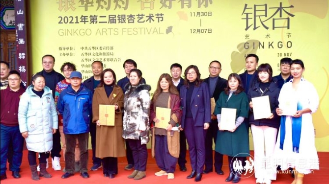 本屆銀杏藝術(shù)節(jié)由中共五華區(qū)委宣傳部指導(dǎo),五華區(qū)文化和旅游局、五華區(qū)文學(xué)藝術(shù)界聯(lián)合會、華山街道黨工委、華山街道辦事處主辦,文林美術(shù)館承辦,酣客酒業(yè)(云南)有限公司、黨建+翠湖文旅產(chǎn)業(yè)聯(lián)盟、翠湖公園和昆明市新的社會階層人士自由職業(yè)及社會組織專聯(lián)會協(xié)辦。中共五華區(qū)委常委、區(qū)委統(tǒng)戰(zhàn)部部長李正興、華山街道黨工委書記付敏、云南省人民政府辦公廳工會主席陳永惠、云南大學(xué)東陸校區(qū)綜合管理服務(wù)中心副主任王偉志、云南陸軍講武堂歷史博物館館長楊俊、五華區(qū)文化和旅游局副局長朱娜、翠湖公園黨支部書記廖利新、翠湖公園管理處主任郭宏偉、云南陽光事達(dá)集團(tuán)總裁、酣客酒業(yè)(云南)有限公司總經(jīng)理陳紹兵等領(lǐng)導(dǎo)出席了本次活動開幕式。