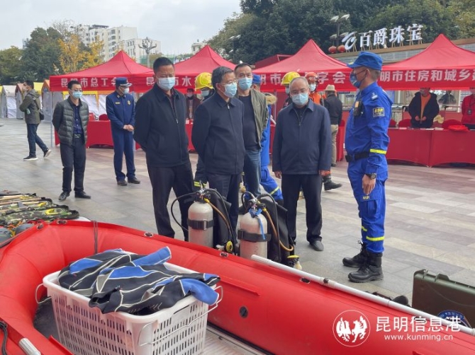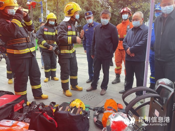 在應(yīng)急裝備展示區(qū),昆明市消防救援支隊(duì)、市森林消防支隊(duì)、藍(lán)天救援隊(duì)現(xiàn)場向與會(huì)的省、市、區(qū)相關(guān)領(lǐng)導(dǎo)及市民進(jìn)行急救援裝備展示和講解。