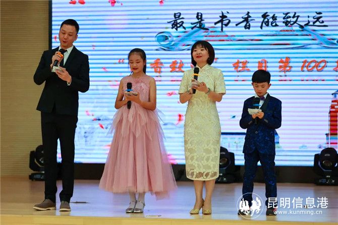 昆明信息港訊 記者江楓 腹有詩(shī)書(shū)氣自華,最是書(shū)香能致遠(yuǎn)。12月1日,云大附中星耀學(xué)校小學(xué)部舉行“書(shū)香致遠(yuǎn)”100期慶典。當(dāng)天下午,慶典活動(dòng)在學(xué)校風(fēng)雨球場(chǎng)舉行。楊瑞(老師)、謝宇(家長(zhǎng))、劉遠(yuǎn)(三年級(jí)學(xué)生)、許琪琪(六年級(jí)學(xué)生)共同擔(dān)任主持人。