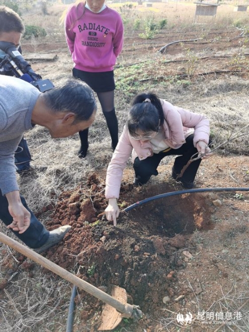 最后,專家們到魯黑村,進一步了解農(nóng)村基本情況,結(jié)合魯黑村實際情況提供專業(yè)指導(dǎo)。村合作社3年前種植了55畝藍莓迷宮,至今長勢差、不掛果,村民都急壞了。昆明市農(nóng)科院經(jīng)作所副所長陳杉艷下到地里刨土挖苗,通過土壤和水質(zhì)分析、病蟲害判斷、詢問農(nóng)藥水肥情況等途徑,與村民詳細分析原因,并給出了改進治理方案。