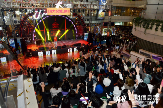 除了多業(yè)態(tài)的暢玩體驗(yàn),昆明大悅城還在周年慶店慶期間,通過(guò)明星嘉年華的形式,匯聚了C-BLOCK盛宇、昆明說(shuō)唱力量滇聲氣、Double face等一眾明星,深入洞察年輕潮人的社交及生活屬性并產(chǎn)生粘性,引爆春城青年的關(guān)注力。僅抖音話(huà)題發(fā)酵明星熱點(diǎn)的日均流量,就突破了10萬(wàn)。12月11日當(dāng)天,萬(wàn)人匯集昆明大悅城城市會(huì)客廳,在2000平的天幕夜景下合唱《大熱門(mén)》、《教官》、《更上》,為大悅城消費(fèi)者帶來(lái)更多先鋒前沿的音樂(lè)鑒賞。