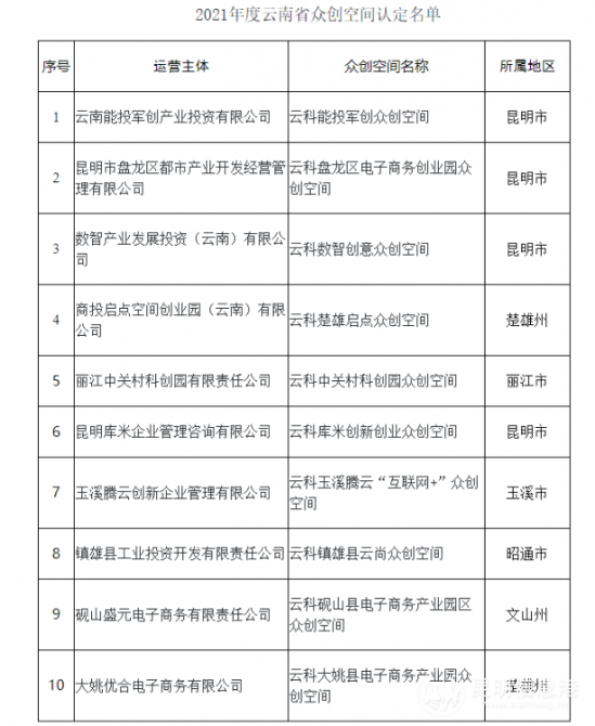 昆明信息港訊 記者戴云 12月15日,云南省科技廳發(fā)布《關(guān)于認(rèn)定2021年度云南省眾創(chuàng)空間的通知》,根據(jù)通知,10家單位認(rèn)定為云南省眾創(chuàng)空間。