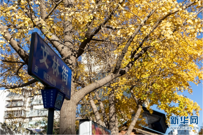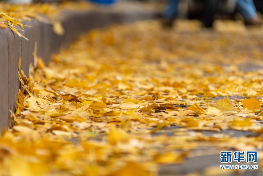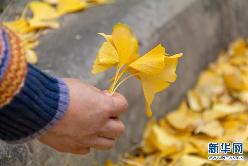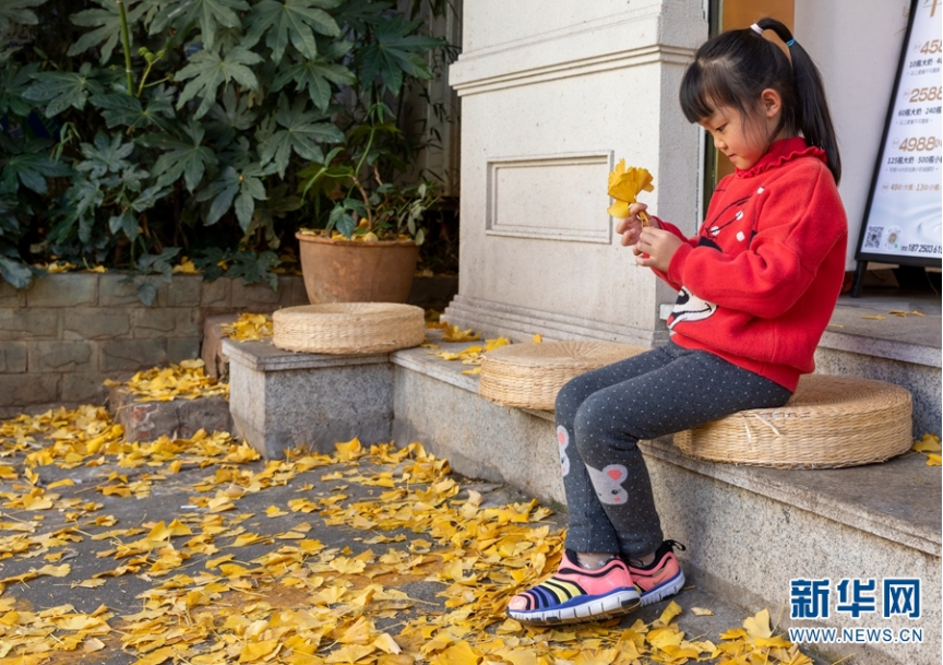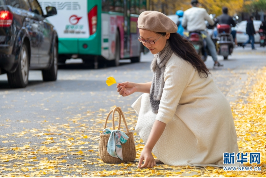 游人在文林街撿拾銀杏葉(攝于12月10日)。(新華網(wǎng) 李浩/攝)