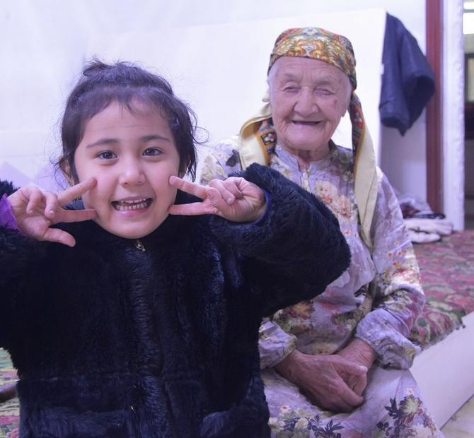 熱比汗·買買提老人和重孫女(前)在一起。 新華社記者 顧煜 攝