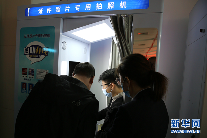 市民在賽罕區(qū)政務(wù)服務(wù)大廳“24小時(shí)政務(wù)服務(wù)超市”進(jìn)行證件照片自助拍照。新華網(wǎng) 石毅 攝