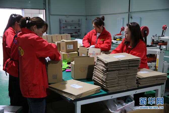 在賽罕區(qū)金河鎮(zhèn)曙光村“正北方云倉(cāng)”電商平臺(tái)打包車(chē)間,工作人員正在分貨裝箱。新華網(wǎng) 石毅 攝
