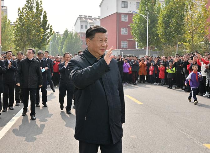 2021年10月22日,習(xí)近平總書記在山東省濟(jì)南市主持召開深入推動(dòng)黃河流域生態(tài)保護(hù)和高質(zhì)量發(fā)展座談會(huì)并發(fā)表重要講話。這是座談會(huì)前,總書記在東營(yíng)市墾利區(qū)董集鎮(zhèn)楊廟社區(qū)考察時(shí),向社區(qū)干部群眾揮手致意。