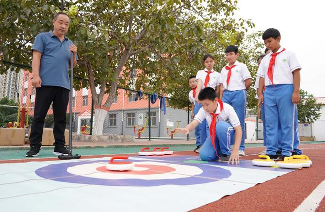 2021年9月23日,河北省邢臺(tái)市內(nèi)丘縣平安小學(xué)學(xué)生在“第二課堂”練習(xí)陸地冰壺。