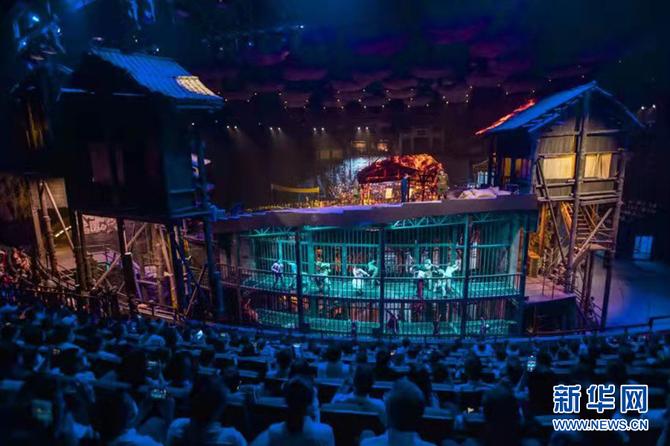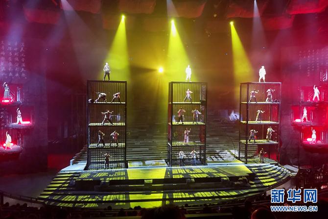 圖為大型紅色舞臺(tái)劇《重慶 1949》演出現(xiàn)場(chǎng)。由5個(gè)大型圓環(huán)構(gòu)件而成的舞臺(tái)可實(shí)現(xiàn)360度旋轉(zhuǎn)。新華網(wǎng) 發(fā)