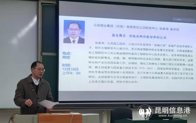 云南錫業(yè)集團(tuán)(控股)有限責(zé)任公司研發(fā)中心副主任張家濤高級工程師(入選2020年“春城計(jì)劃”產(chǎn)業(yè)技術(shù)領(lǐng)軍人才專項(xiàng))為師生帶來《傳統(tǒng)材料和新材料的認(rèn)識》的報告。