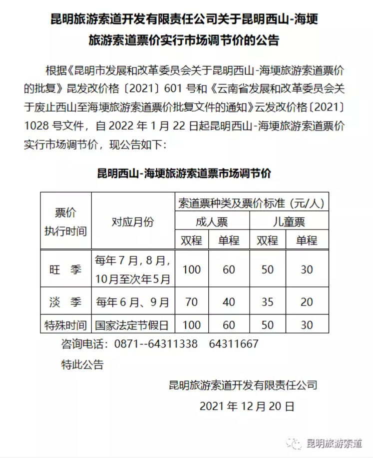 據(jù)“昆明旅游索道”微信公眾號(hào)的消息,12月20日,昆明旅游索道開(kāi)發(fā)有限責(zé)任公司發(fā)布《關(guān)于昆明西山-海埂旅游索道票價(jià)實(shí)行市場(chǎng)調(diào)節(jié)價(jià)的公告》稱,自2022年1月22日起昆明西山-海埂旅游索道票價(jià)實(shí)行市場(chǎng)調(diào)節(jié)價(jià)。