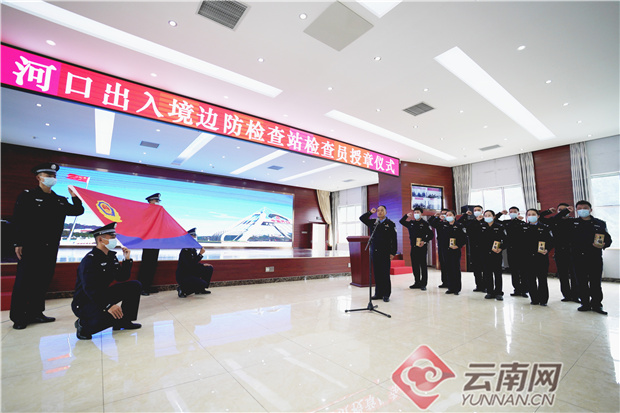 河口出入境邊防檢查站隆重舉行新入職檢查員授章儀式。通訊員供圖