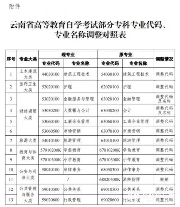 此外,自2022年4月云南省高等教育自學(xué)考試報名開始,含建筑工程技術(shù)在內(nèi)的共計11個??茖I(yè)將啟用新專業(yè)代碼及名稱報名。需要注意的是,自2022年6月審核辦理畢業(yè)證書起,涉及調(diào)整專業(yè)代碼和名稱的專業(yè)均按新專業(yè)名稱核發(fā)畢業(yè)證書,同時停發(fā)舊專業(yè)名稱畢業(yè)證書。