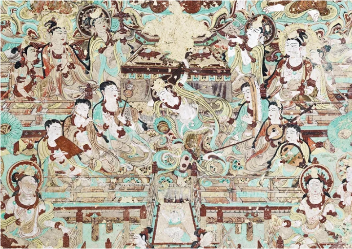 圖為莫高窟第112窟南壁壁畫“反彈琵琶樂舞圖”。這幅壁畫是多元文化交流融合的藝術結晶,鮮明體現(xiàn)了中華文明海納百川、開放包容的廣闊胸襟。敦煌研究院供圖