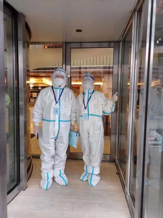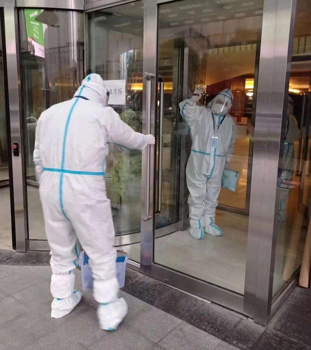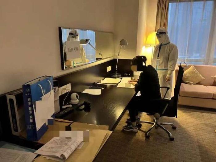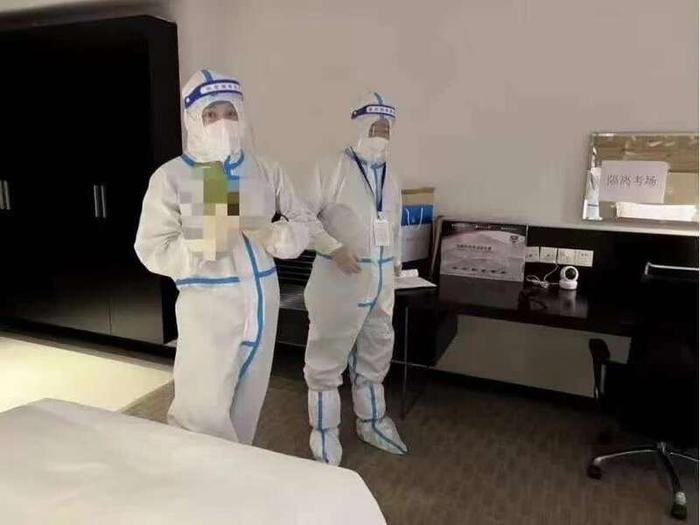 兩位老師在酒店外穿好防護服,熟練做好防護措施后,提前進入酒店的隔離考場。這套流程,他們已在事前培訓(xùn)中演練不下10遍,在心里更是反復(fù)模擬推敲。雖然這場特殊監(jiān)考前所未有,但兩位老師并不是特別擔(dān)心。因為早在前一天,他們便與考生小楊通過視頻電話,告知流程并了解了學(xué)生健康情況。