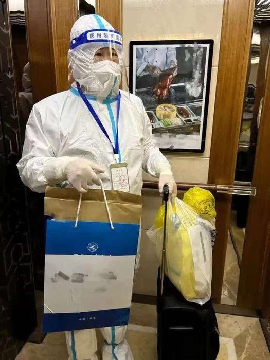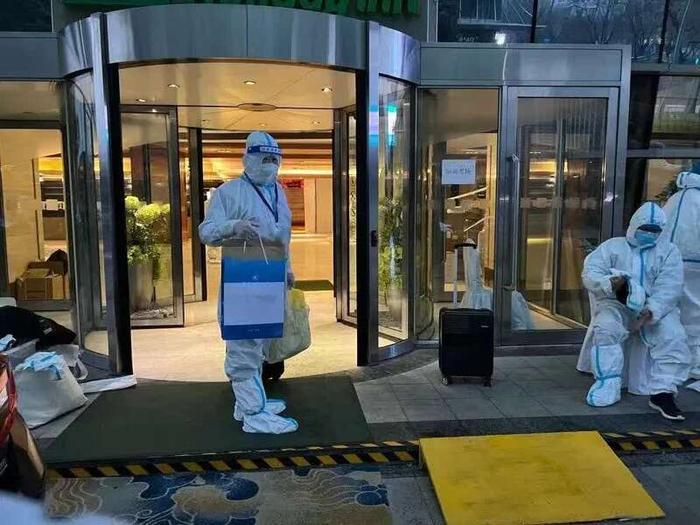 “送考”老師們兩人一組,全程錄像。經(jīng)過20分鐘車程,高新區(qū)綠地假日酒店的送考老師魯衛(wèi)平和喬彩燕帶著試卷和隔離用品按原計劃抵達,這里有一位集中隔離的B類密接考生正等著他們。