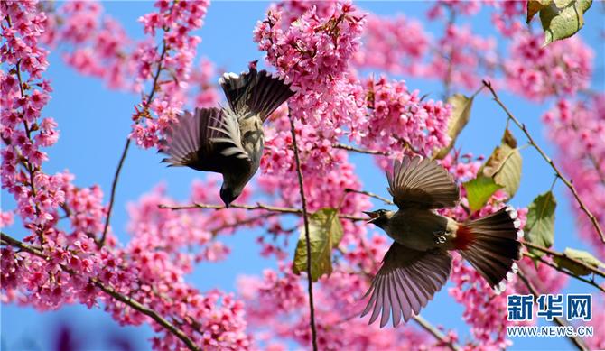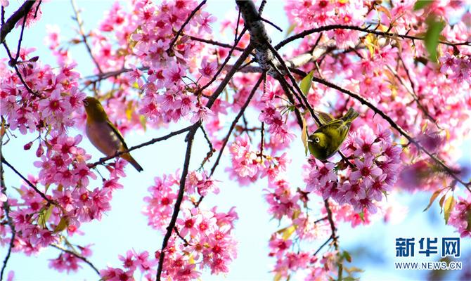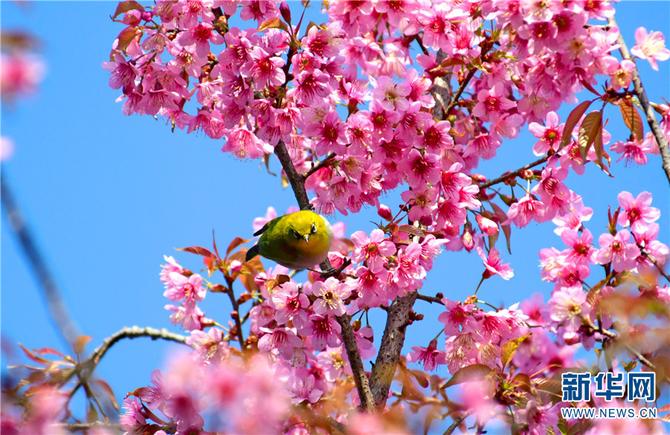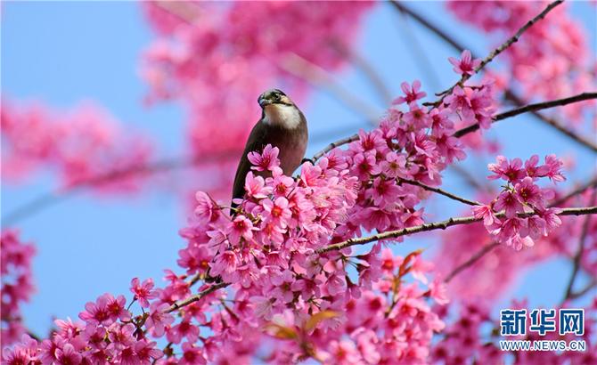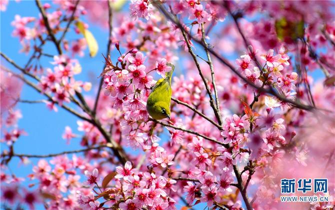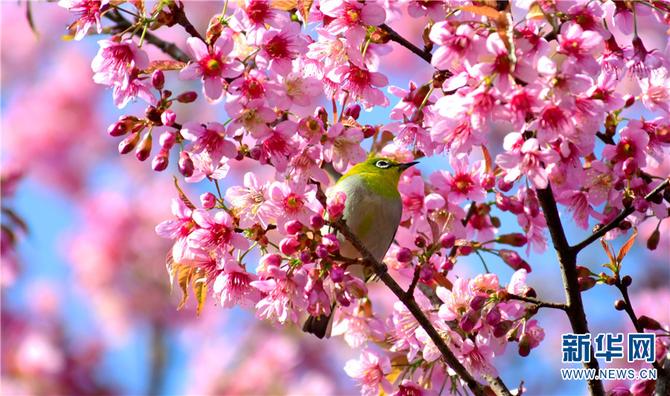 近日,云南省紅河哈尼族彝族自治州彌勒市城區(qū),櫻花爭相綻放,鳥兒在枝頭嬉戲,鳥語花香,靜待春來。新華網(wǎng)發(fā)(普佳勇攝影報道)