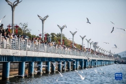 游客在昆明市紅塔西路觀賞冬櫻花。