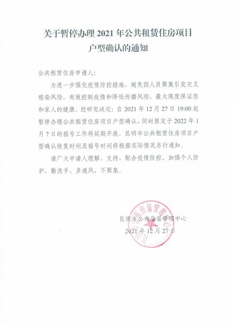 昆明信息港訊 記者上官艷君 12月27日,昆明市公有房屋管理中心發(fā)布《關(guān)于暫停辦理2021年公共租賃住房項(xiàng)目戶型確認(rèn)的通知》。