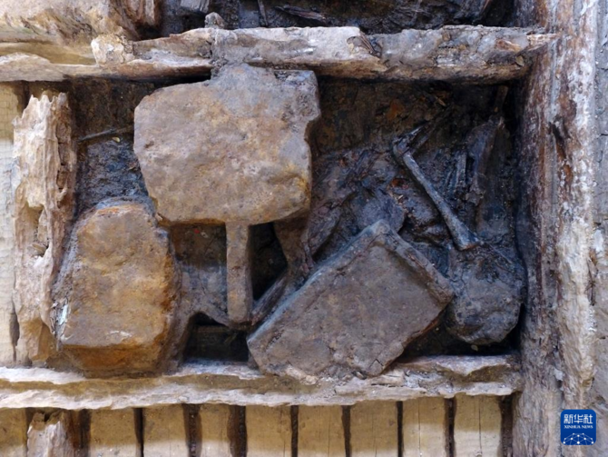 墓葬是東西向中字形豎穴土坑墓,東西兩側有斜坡狀墓道,外圍有近長方形圍溝環(huán)繞。墓室面積約230平方米。槨室由下方的墊木、底板,周邊的側板、內部的立柱和上方的蓋板組成。經(jīng)鑒定,槨室各部位均使用楠木。槨蓋板上覆蓋有多層用杉木削制的金黃色木皮。槨室內被分隔為25個分室。槨室內放置7具棺木,中部船形獨木棺為主棺,其余6具為陪葬棺。
