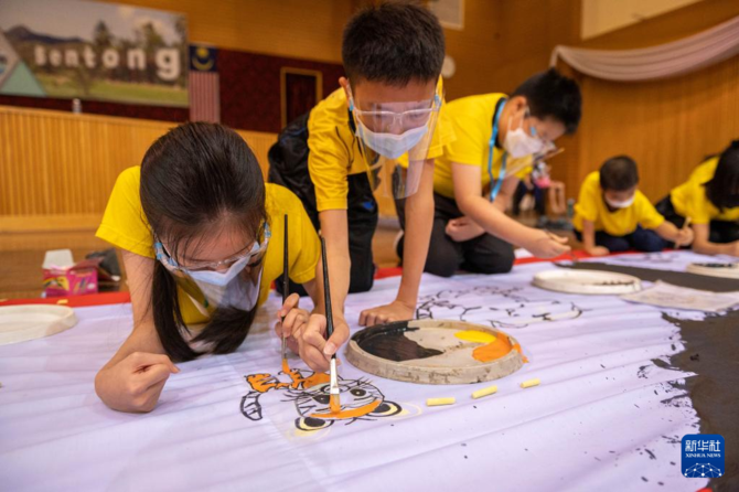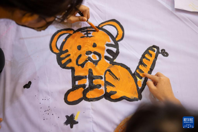 12月26日,學生們在馬來西亞彭亨州文冬創(chuàng)作老虎主題年畫。