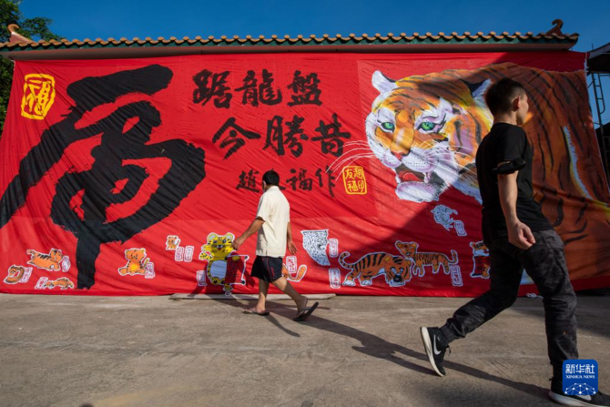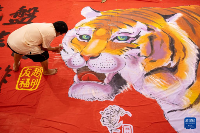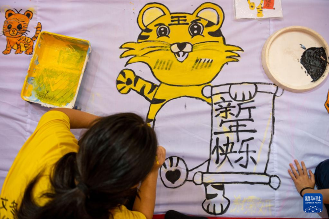 為迎接農(nóng)歷虎年的到來,文冬當?shù)匾患胰A人團體邀請畫家和學生一起創(chuàng)作了一幅11.5米長、4.5米寬的老虎年畫。