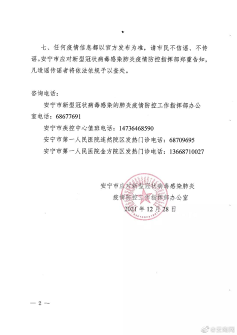 咨詢電話:安寧市新型冠狀病毒感染的肺炎疫情防控工作指揮部辦公室電話:68677691