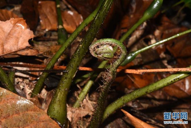 素功蓮座蕨,蓮座蕨屬新種,發(fā)現(xiàn)于云南大圍山國家級(jí)自然保護(hù)區(qū)。雖然是“新面孔”,但事實(shí)上,蓮座蕨屬植物起源悠久,是現(xiàn)存最古老的蕨類植物之一。它的名字背后也還有一段故事,科研工作者將其命名為“素功”,以此紀(jì)念中國科學(xué)院昆明植物研究所已故植物學(xué)家武素功對(duì)中國蕨類植物研究作出的重要貢獻(xiàn)。圖為素功蓮座蕨幼葉(資料圖片)。新華網(wǎng)發(fā)(云南大圍山國家級(jí)自然保護(hù)區(qū) 供圖)
