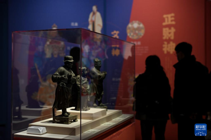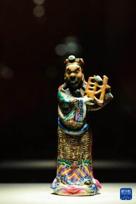 這是12月28日在成都博物館“富貴長(zhǎng)春——中國(guó)傳統(tǒng)財(cái)富文化展”上拍攝的粉彩財(cái)神瓷立像。