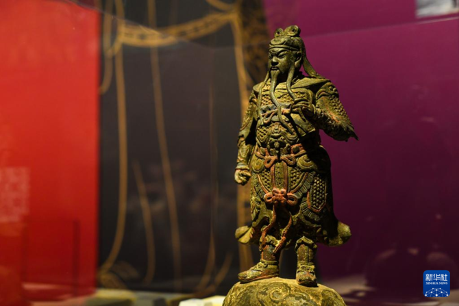這是12月28日在成都博物館“富貴長(zhǎng)春——中國(guó)傳統(tǒng)財(cái)富文化展”上拍攝的彩繪關(guān)公銅立像。