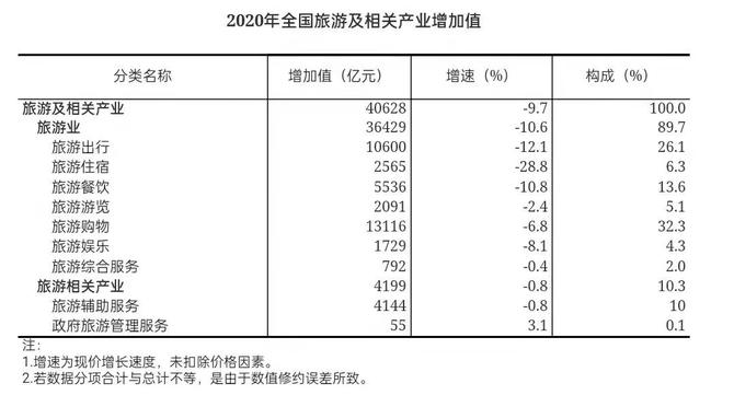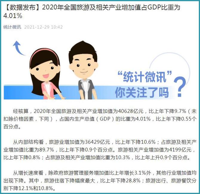 據(jù)統(tǒng)計微訊微信公眾號消息,經(jīng)核算,2020年全國旅游及相關(guān)產(chǎn)業(yè)增加值為40628億元,比上年下降9.7%(未扣除價格因素,下同),占國內(nèi)生產(chǎn)總值(GDP)的比重為4.01%,比上年下降0.55個百分點。